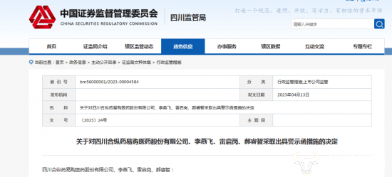 今年4月3日,中国证监会四川监管局发布一则《关于四川合纵药易购医药股份有限公司、李燕飞、雷启岗、郝睿智采取出具警示函措施的决定》。药易购在董事会履职、募集资金管理和使用以及内控制度执行三方面存在违规行为,因此连同相关人员一起被其采取了出具警示函的行政监管措施。
