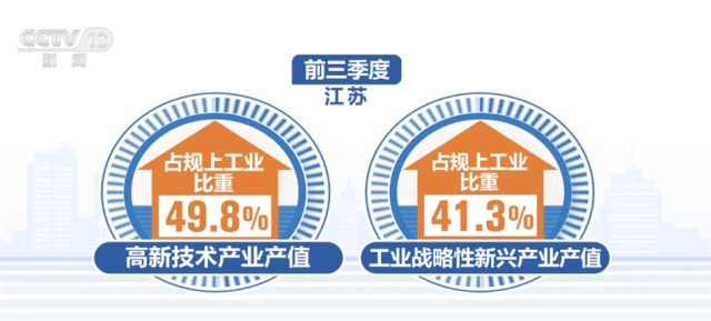 江苏省今年以来不断壮大先进制造业规模,前三季度,江苏省高新技术产业、工业战略性新兴产业产值占规上工业比重分别为49.8%、41.3%,比上半年均有提升。前三季度,新能源汽车、充电桩产量分别增长80.2%和1.1倍。