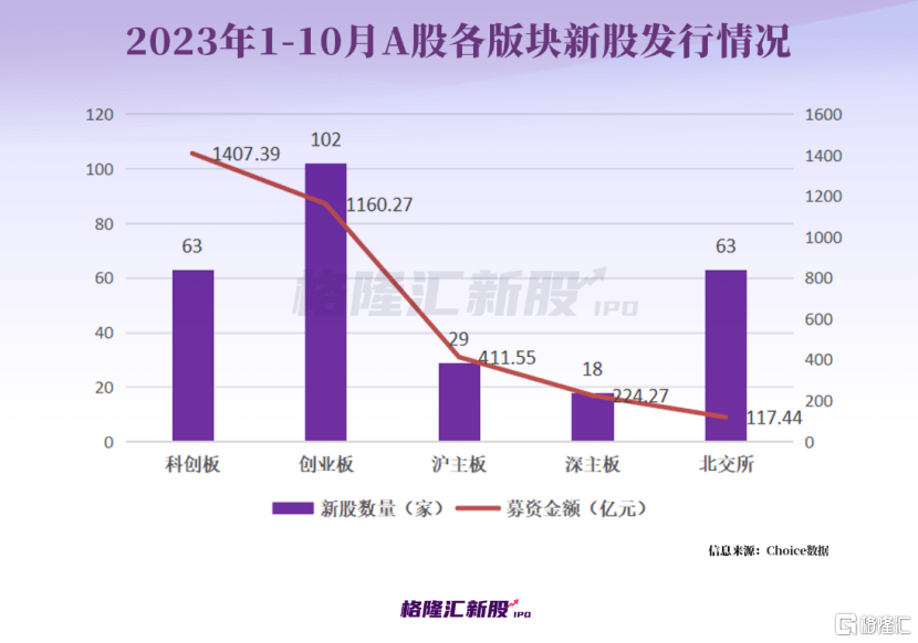 据Choice数据显示,2023年1-10月,A股共有275家新股上市,募资总额约3320.92亿元。其中,募集资金最多的是科创板,63家上市新股累计募资约1407.39亿元;创业板的上市新股数量最多,达到102家,累计募资额也超千亿。
