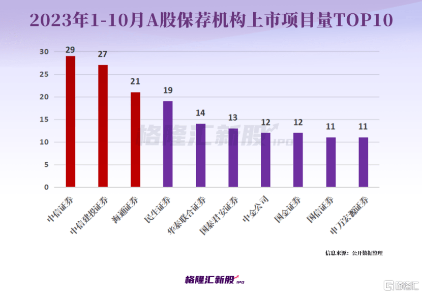 保荐机构方面,据统计,今年前10个月参与A股IPO的保荐机构有51家,其中项目数排名前三的券商依旧是中信证券、中信建投证券、海通证券。