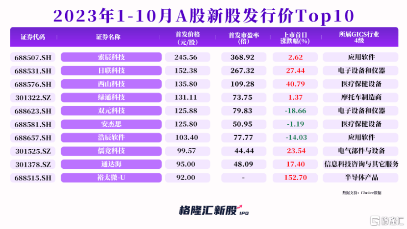 今年10月登陆A股的公司中,有骑士乳业、卓兆点胶、浩辰软件等4家在上市首日破发,其余均实现上涨。其中浩辰软件的首发价格高达103.4元,成为科创板的又一百元股,其在今年前10个月登陆A股的公司中首发价格排在第7名。