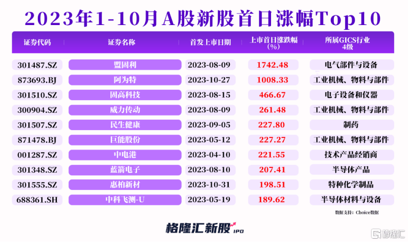 比如10月27日上市的北交所新股阿为特,在上市首日暴涨超1008%,位居A股2023年1-10月新股首日涨幅榜第二,仅次于盟固利。