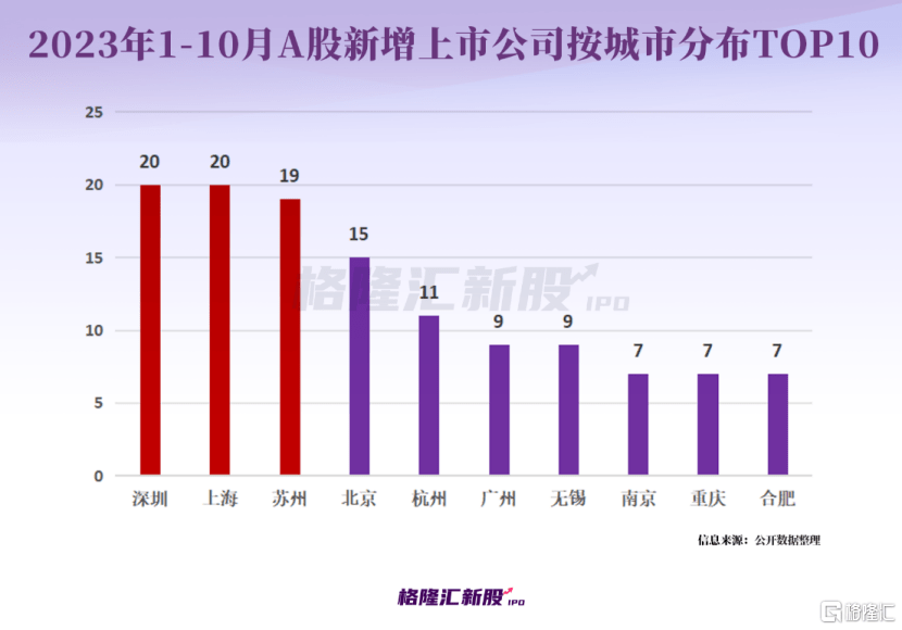 按地区划分,2023年1-10月,新增A股上市公司最多的城市是深圳和上海,均为20家,苏州为19家排在第三,北京、杭州、无锡、广州、南京、重庆、合肥也上榜新增A股上市公司最多的前十大城市。