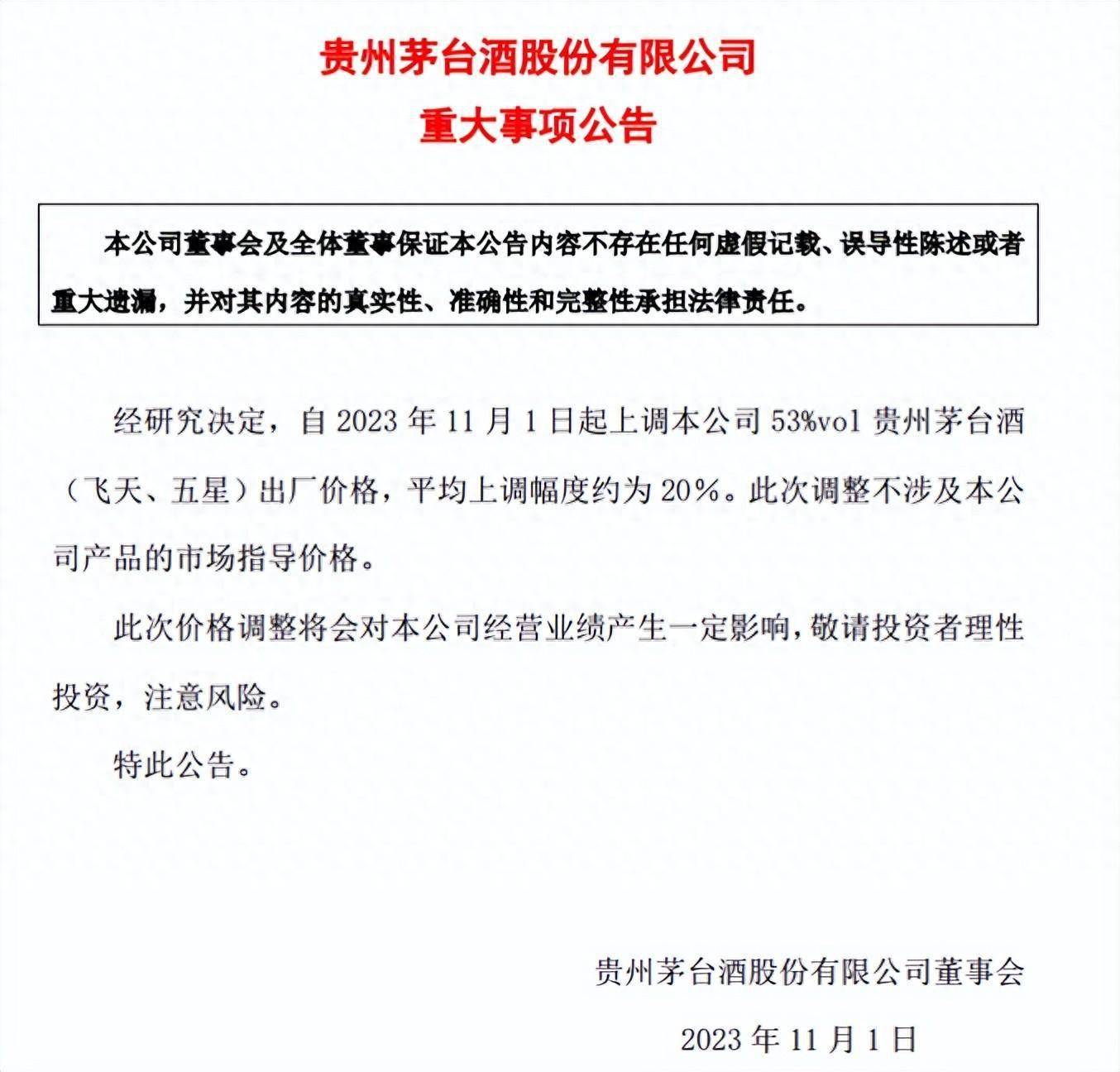 10月31日晚间,贵州茅台酒股份有限公司发布公告,宣布从11月1日起上调本公司53%vol贵州茅台酒(飞天、五星)出厂价格,平均上调幅度约为20%,此次调整不涉及本公司产品的市场指导价格。