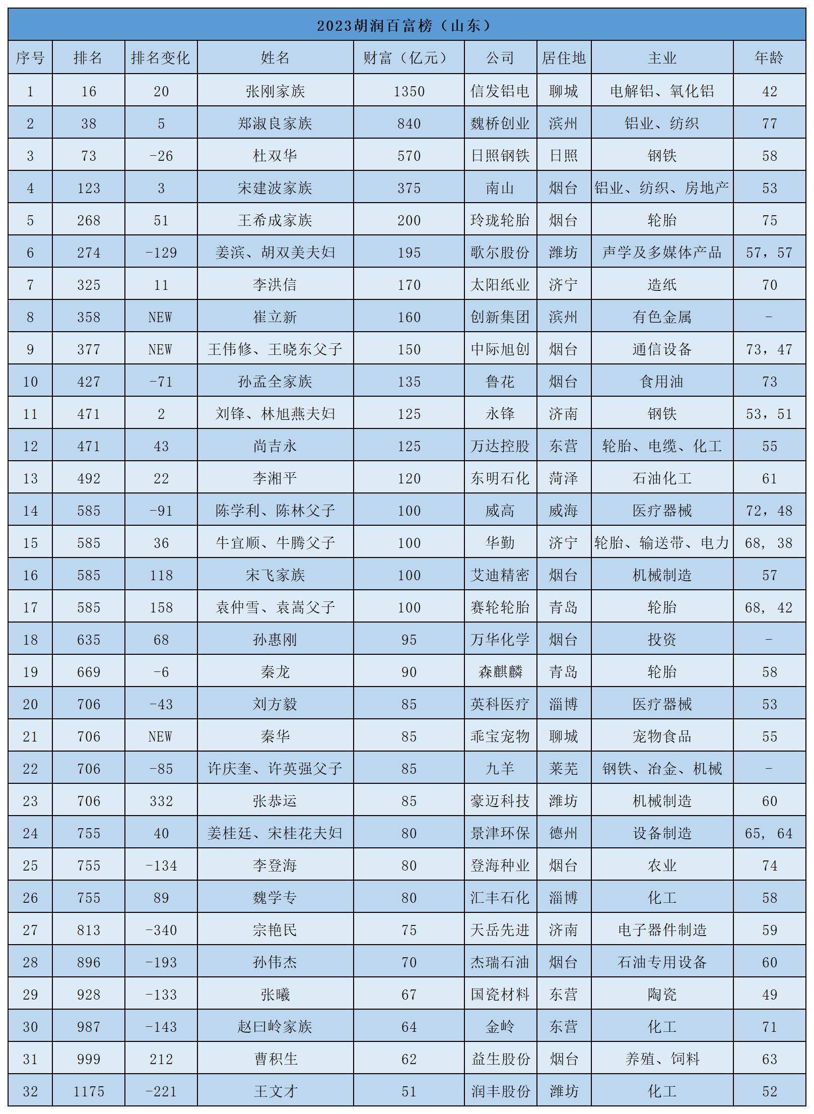 张刚家族再度成为山东首富,排在第16位,较去年上升20个名次;他是今年财富增长最多的企业家之一,身家同比大涨42%(400亿元)至1350亿元。