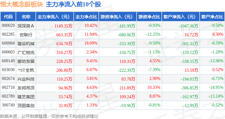 从资金流向上来看,当日恒大概念股板块主力资金净流出1.74亿元,游资资金净流入7409.84万元,散户资金净流入1.0亿元。恒大概念股板块个股资金流向见下表: