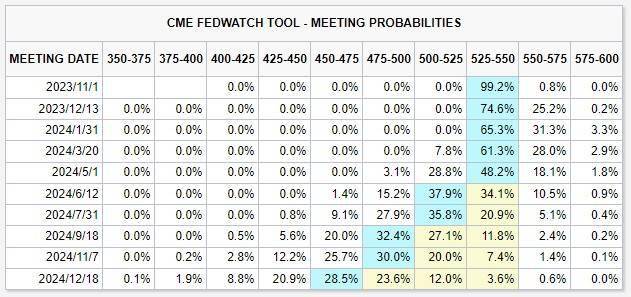 ADP数据公布后,美联储本周加息概率降至接近0%。据CME“美联储观察”的数据显示,美联储本周维持利率在5.25%-5.50%区间不变的概率为99.2%,加息25个基点至5.50%-5.75%区间的概率为0.8%。到12月维持利率不变的概率为74.6%,累计加息25个基点概率为25.2%,累计加息50个基点概率为0.2%。