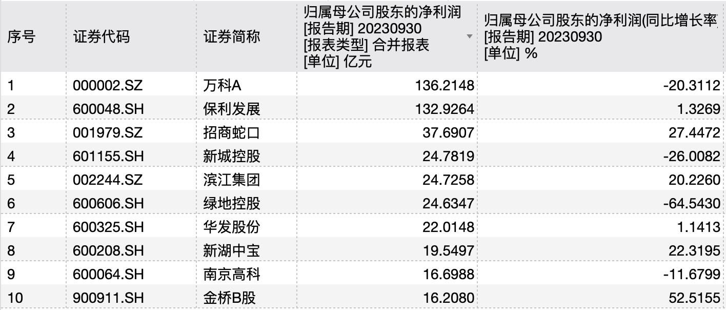 2023年前三季度A股上市房企归母净利润TOP10 来源:Wind