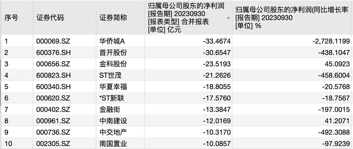 2023年前三季度A股上市房企归母净利润亏损TOP10 来源:Wind