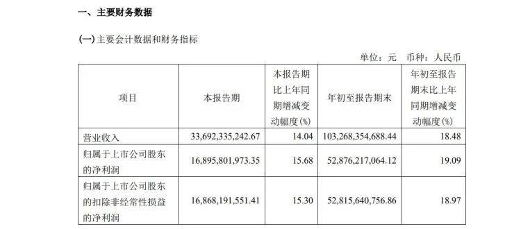据贵州茅台10月20日晚间发布的三季报显示,2023年前三季度,公司实现营业收入1032.68亿元,同比增长18.48%;归属于上市公司股东的净利润528.76亿元,同比增长19.09%。2023年第三季度,公司实现营业收入336.92亿元,同比增长14.04%;归属于上市公司股东的净利润168.96亿元,同比增长15.68%。