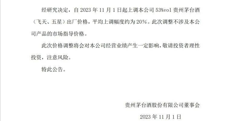 市场虽有预期,但在发布时点上却无一丝丝“防备”!贵州茅台10月31日深夜突然放出震惊酒业乃至A股的大招:提价!公司发布重大事项公告称:经研究决定,自2023年11月1日起上调本公司53%vol贵州茅台酒(飞天、五星)出厂价格,平均上调幅度约为20%。此次调整不涉及本公司产品的市场指导价格。此次价格调整将会对本公司经营业绩产生一定影响,敬请投资者理性投资,注意风险。