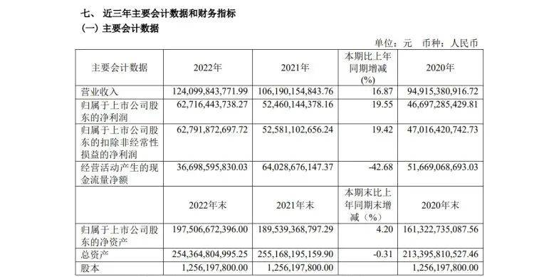 2023年3月31日,贵州茅台披露2022年年报,这是丁雄军接任贵州茅台董事长后的首份完整年报。年报显示,2022年,贵州茅台实现营业收入1241亿元,同比增长16.87%;归属于上市公司股东的净利润627.16亿元,同比增长19.55%。