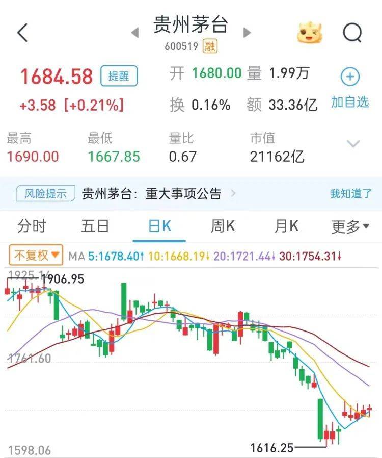 二级市场上,截至10月31日A股收盘,贵州茅台收报1684.58元/股,涨0.21%,公司最新总市值2.1162万亿元。