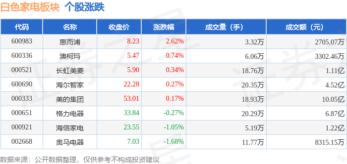 证券之星消息,11月1日白色家电板块较上一交易日上涨0.05%,惠而浦领涨。当日上证指数报收于3023.08,上涨0.14%。深证成指报收于9826.73,下跌0.38%。白色家电板块个股涨跌见下表:
