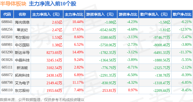 从资金流向上来看,当日半导体板块主力资金净流入1.14亿元,游资资金净流出1.87亿元,散户资金净流入7377.93万元。半导体板块个股资金流向见下表: