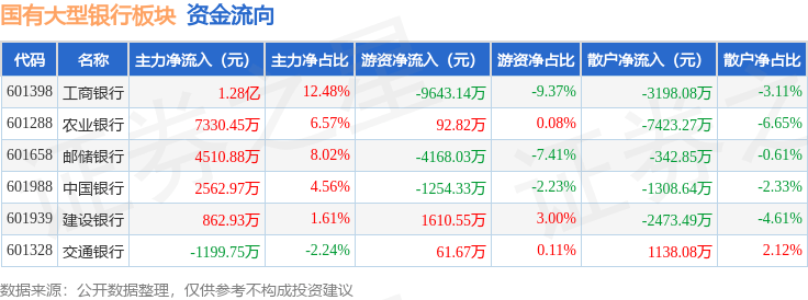 从资金流向上来看,当日国有大型银行板块主力资金净流入2.69亿元,游资资金净流出1.33亿元,散户资金净流出1.36亿元。国有大型银行板块个股资金流向见下表: