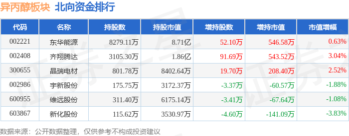 北向资金方面,当日异丙醇板块北向资金持股市值为12.7亿元,增持0.1亿元。其中增持最多的是东华能源,增持了546.58万元。减持持最多的是新化股份,减持了141.09万元。异丙醇板块北向资金持股变动明细见下表: