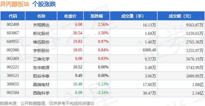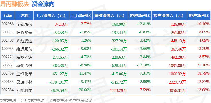 从资金流向上来看,当日异丙醇板块主力资金净流出8406.52万元,游资资金净流出823.32万元,散户资金净流入9229.84万元。异丙醇板块个股资金流向见下表: