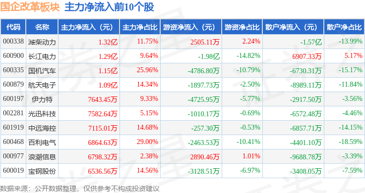 从资金流向上来看,当日国企改革板块主力资金净流出28.22亿元,游资资金净流入8.06亿元,散户资金净流入20.16亿元。国企改革板块个股资金流向见下表: