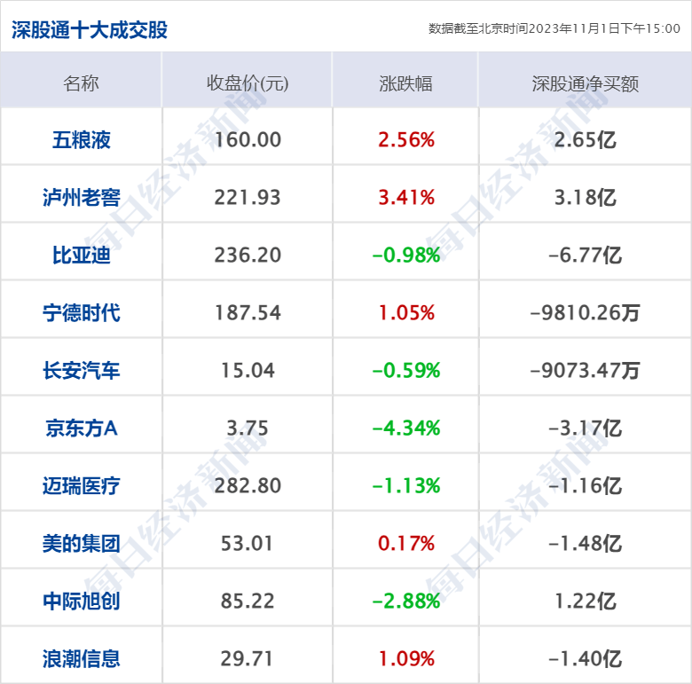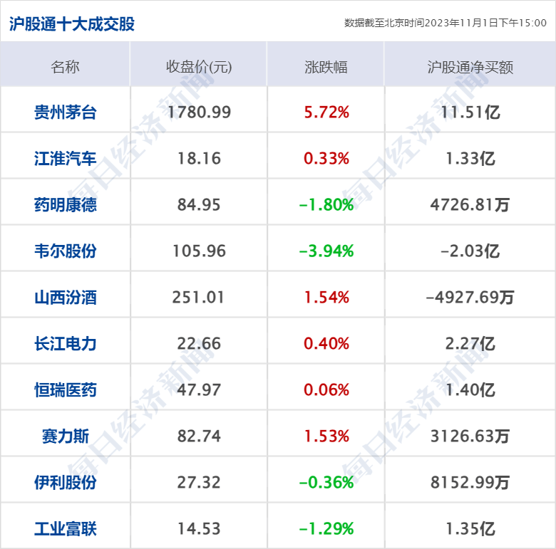 11月1日,北向资金净卖出20.83亿元。其中沪股通净买入3.62亿元,深股通净卖出24.45亿元。北向资金成交活跃个股榜单中,净买入个股共11只,金额最多的是贵州茅台(600519.SH,收盘价:1780.99元),净买入11.512亿元;净卖出个股共9只,金额最多的是比亚迪(002594.SZ,收盘价:236.2元),净卖出6.770亿元。