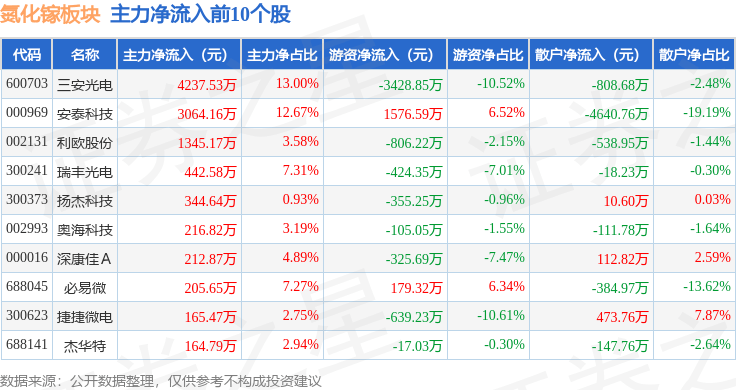 从资金流向上来看,当日氮化镓板块主力资金净流出3.84亿元,游资资金净流出1.04亿元,散户资金净流入4.88亿元。氮化镓板块个股资金流向见下表:
