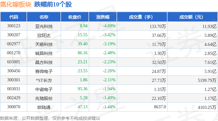 北向资金方面,当日氮化镓板块北向资金持股市值为122.99亿元,减持0.11亿元。其中增持最多的是领益智造,增持了0.49亿元。减持持最多的是欣旺达,减持了0.46亿元。氮化镓板块北向资金持股变动明细见下表: