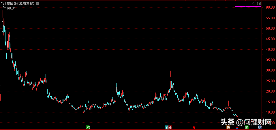 要知道,在上市时*ST越博发行价为23.34元/股,上市初其股价曾最高涨至108.55元/股(前复权60.31元/股),随后便开始一路下跌,到现在跌至5元附近,距离高位跌幅已经超92%……