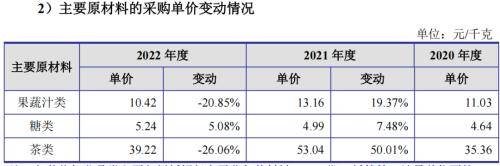 2022年,糖类采购单价持续上涨至5.24元/千克,涨幅为5.08%;果蔬汁类和茶类采购单价分别下降了20.85%、26.06%。由此可见,公司的原材料采购价格波动较大。