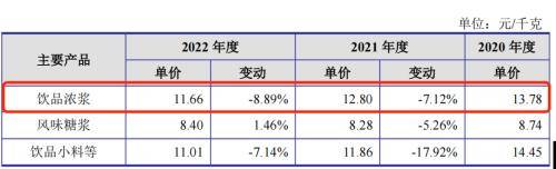 2022年,在风味糖浆销售单价小幅增长的情况下,占据收入“大头”的饮品浓浆销售单价继续下降至11.66元/千克,降幅高达8.89%,是当期售价降幅最大的产品。