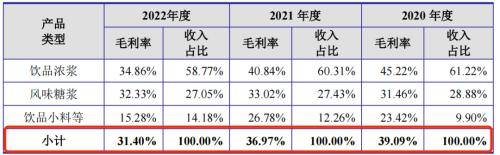 尤其是饮品浓浆,作为公司最大的业务类别,其毛利率由2020年的45.22%下滑至2022年的34.86%,下降了10.36个百分点。