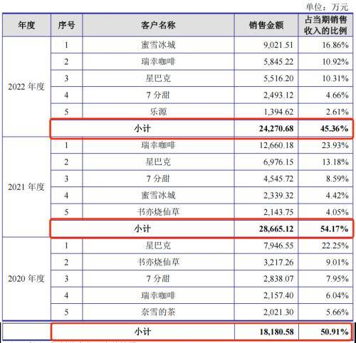 例如星巴克,2022年采购金额减少至5516.20万元,7分甜2022年采购金额为2493.12万元,由第三大客户降至第四大客户;而2021年第五大客户书亦烧仙草到2022年直接跌出前五大客户之列。