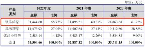 在主营业务中,饮品浓浆为德馨食品主要收入来源。报告期内,公司饮品浓浆收入分别为2.19亿元、3.19亿元和3.14亿元,占主营业务收入的比例分别为61.22%、60.31%和58.77%。