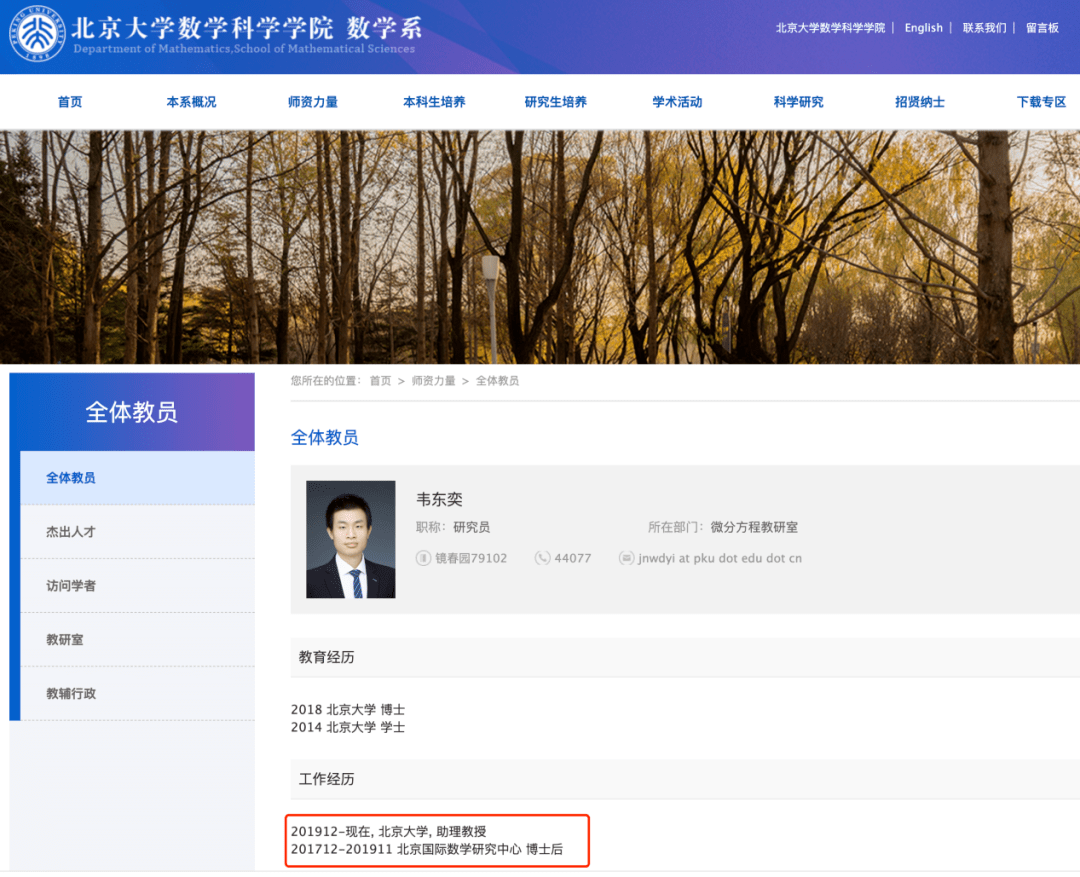 北京大学数学科学学院数学系官网“教师队伍”一栏最新信息显示,韦东奕现在担任北京大学助理教授,所在部门为微分方程教研室。