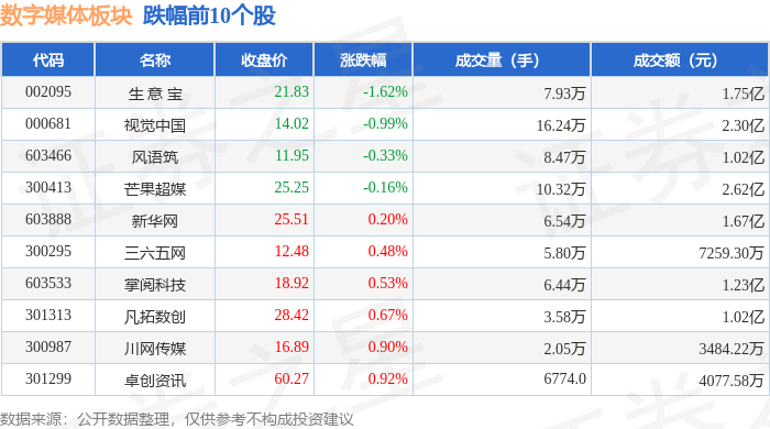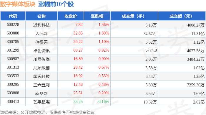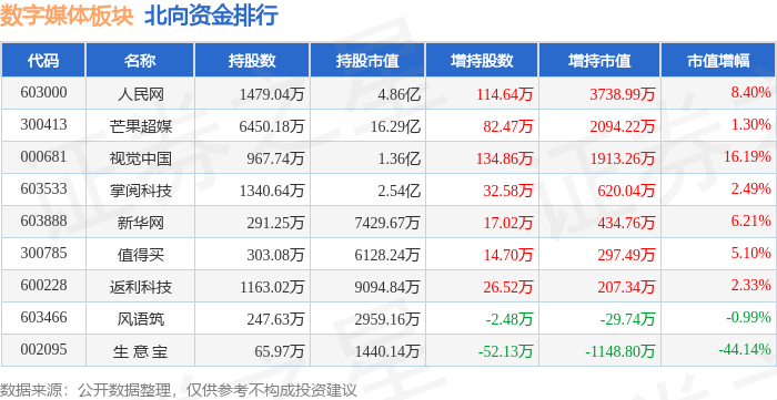 北向资金方面,当日数字媒体板块北向资金持股市值为27.74亿元,增持0.81亿元。其中增持最多的是人民网,增持了0.37亿元。减持持最多的是生 意 宝,减持了0.11亿元。数字媒体板块北向资金持股变动明细见下表: