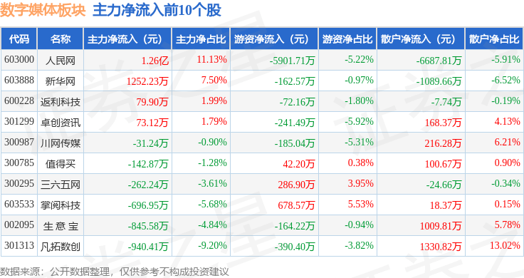 从资金流向上来看,当日数字媒体板块主力资金净流入7875.45万元,游资资金净流出5016.8万元,散户资金净流出2858.65万元。数字媒体板块个股资金流向见下表: