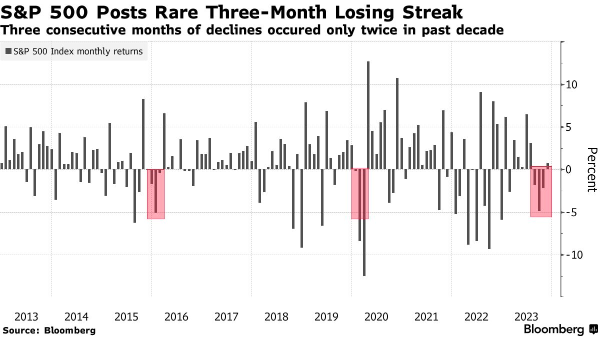 美国股市罕见地连续三个月下跌,但对投资者来说,这也有好的一面:如果历史可以借鉴的话,悲观情绪正在为未来的上涨奠定基础。