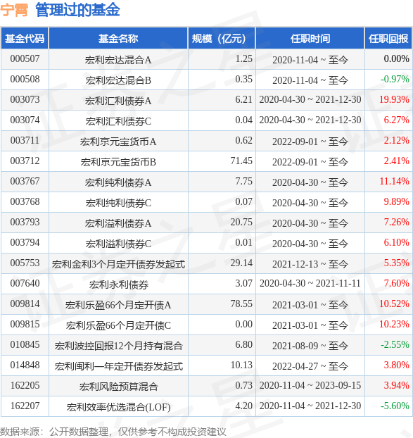 宁霄先生:硕士研究生,中国。2006年4月至2007年3月宁霄先生任职于兴业全球基金管理有限公司,担任基金TA清算;2007年8月至2011年3月宁霄先生任职于华夏基金管理有限公司,担任基金会计;2013年7月至今宁霄先生任职于泰达宏利基金管理有限公司,先后担任债券交易员、交易部交易主管、交易部总经理助理、基金经理助理。自2020年4月30日起任泰达宏利纯利债券型证券投资基金基金经理变更。2020年4月30日担任泰达宏利溢利债券型证券投资基金基金经理。2020年11月4日担任泰达宏利宏达混合型证券投资基金基金经理。2021年3月1日担任泰达宏利乐盈66个月定期开放债券型证券投资基金基金经理。2021年8月9日担任泰达宏利波控回报12个月持有期混合型证券投资基金基金经理。曾任泰达宏利永利债券型证券投资基金、泰达宏利效率优选混合型证券投资基金(LOF)基金经理基金经理、泰达宏利汇利债券型证券投资基金基金经理。2021年12月13日担任泰达宏利金利3个月定期开放债券型发起式证券投资基金基金经理。2022年9月1日起任泰达宏利京元宝货币市场基金基金经理。2020年11月4日至2023年09月15日担任泰达宏利风险预算混合型证券投资基金基金经理。