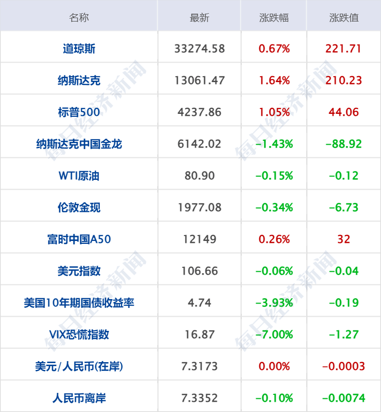 美联储将联邦基金利率维持在5.25%至5.5%不变。美股三大指数集体收涨,纳指涨1.64%,标普500指数涨1.05%,道指涨0.67%。大型科技股走高,脸书涨超3%,微软、亚马逊、奈飞涨超2%,苹果、谷歌涨超1%。AMD涨近10%,WeWork大跌约47%,消息称WeWork计划最早于下周在美国新泽西州申请破产保护。 中概股涨跌参半,纳斯达克中国金龙指数跌1.43%。小鹏汽车涨近7%,理想汽车涨超3%,蔚来涨近2%,京东、阿里巴巴、百度小幅下跌。