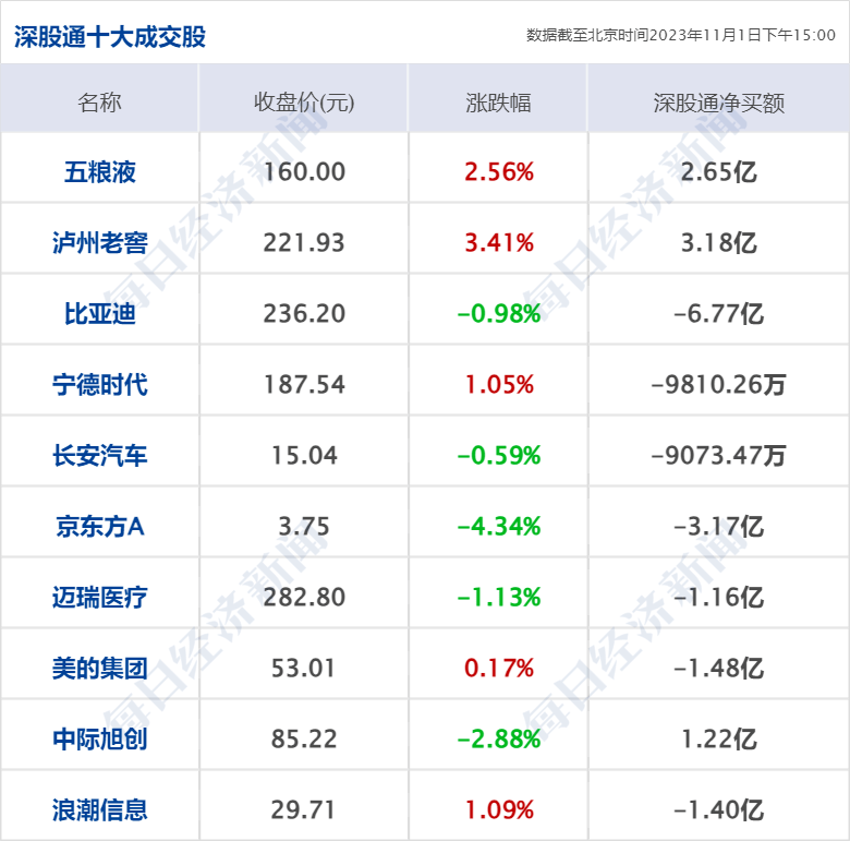 11月1日,北向资金全天净卖出20.82亿元,连续3日减仓;其中,沪股通净买入3.62亿元,深股通净卖出24.45亿元。前十大成交股中,净买入额居前五的是贵州茅台、泸州老窖、五粮液、长江电力、恒瑞医药。