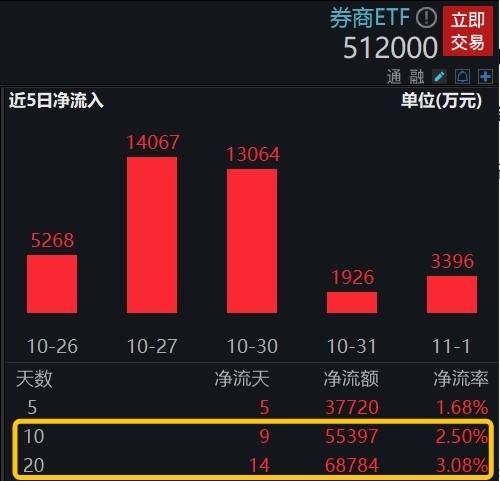 值得注意的是,近期资金涌入券商板块态势显著,以券商ETF(512000)为例,上交所数据显示,券商ETF(512000)已连续7日获资金增仓,累计获净流入4.71亿元;进一步拉长时间看,近10日、近20日资金分别累计净流入5.54亿元、6.88亿元。