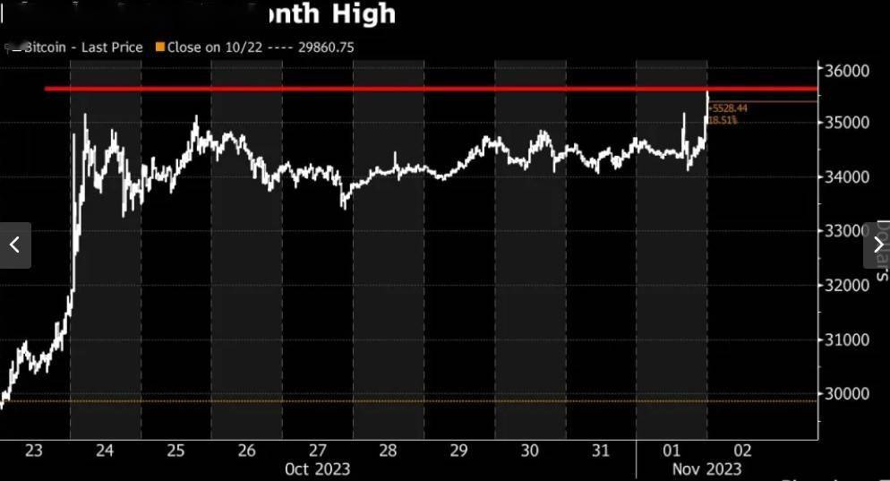 智通财经获悉,比特币攀升至3.5万美元/枚上方,再创17个月新高,因为市场对比特币交易所交易基金(ETF)获批将提振整体需求的预期升温。比特币在10月份上涨28%,创下今年1月以来的最大单月涨幅,原因是人们越来越预期,经过十多年的审议,美国证券交易委员会(SEC)可能很快批准直接投资比特币的ETF。上周一,币价飙升逾11%,原因是交易员猜测,贝莱德拟建的一只比特币基金可能上市,这表明该基金即将获得批准。
