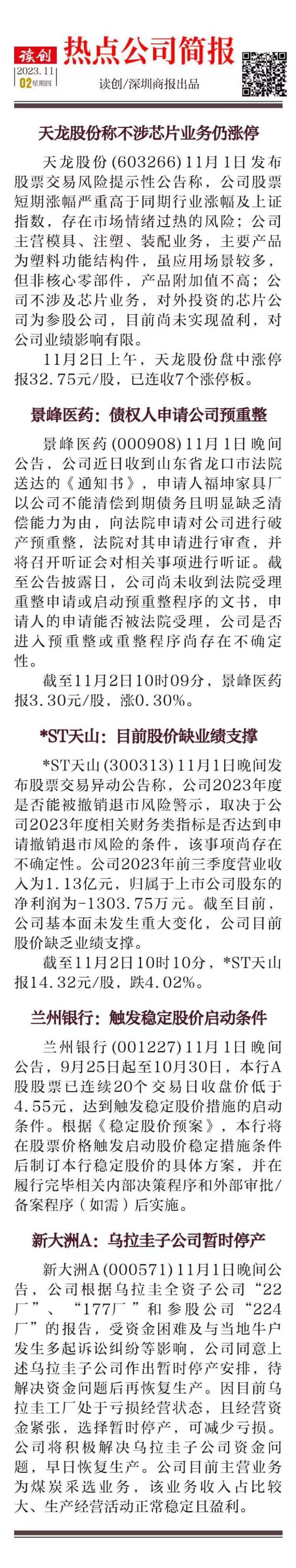 原标题:【原创】热点公司简报|天龙股份称参股芯片公司尚未盈利,仍收七连板;*ST天山称目前股价缺乏业绩支撑,早盘跌逾4%