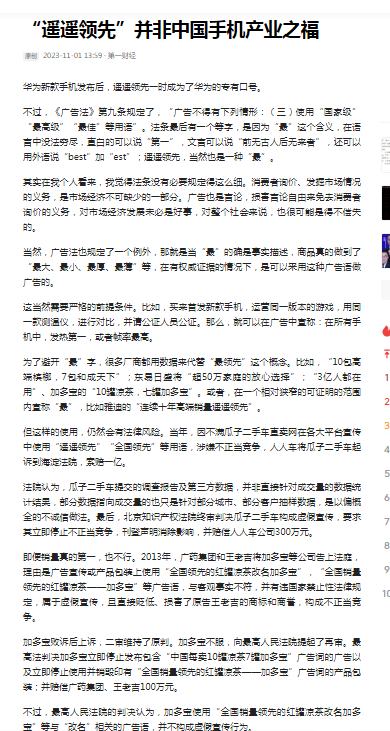 在文章中,作者依据广告法中不准使用“最”之类的宣传表述,还举了案例,如“10包高端槟榔,7包和成天下”;东易日盛将“超50万家庭的放心选择”;“3亿人都在用”、加多宝的“10罐凉茶,七罐加多宝”;瓜子二手车使用“遥遥领先”“全国领先”被海淀法院罚300万元等,也确实说明,华为如果宣传中使用“遥遥领先”表述,确实有可能会涉嫌违反广告法。