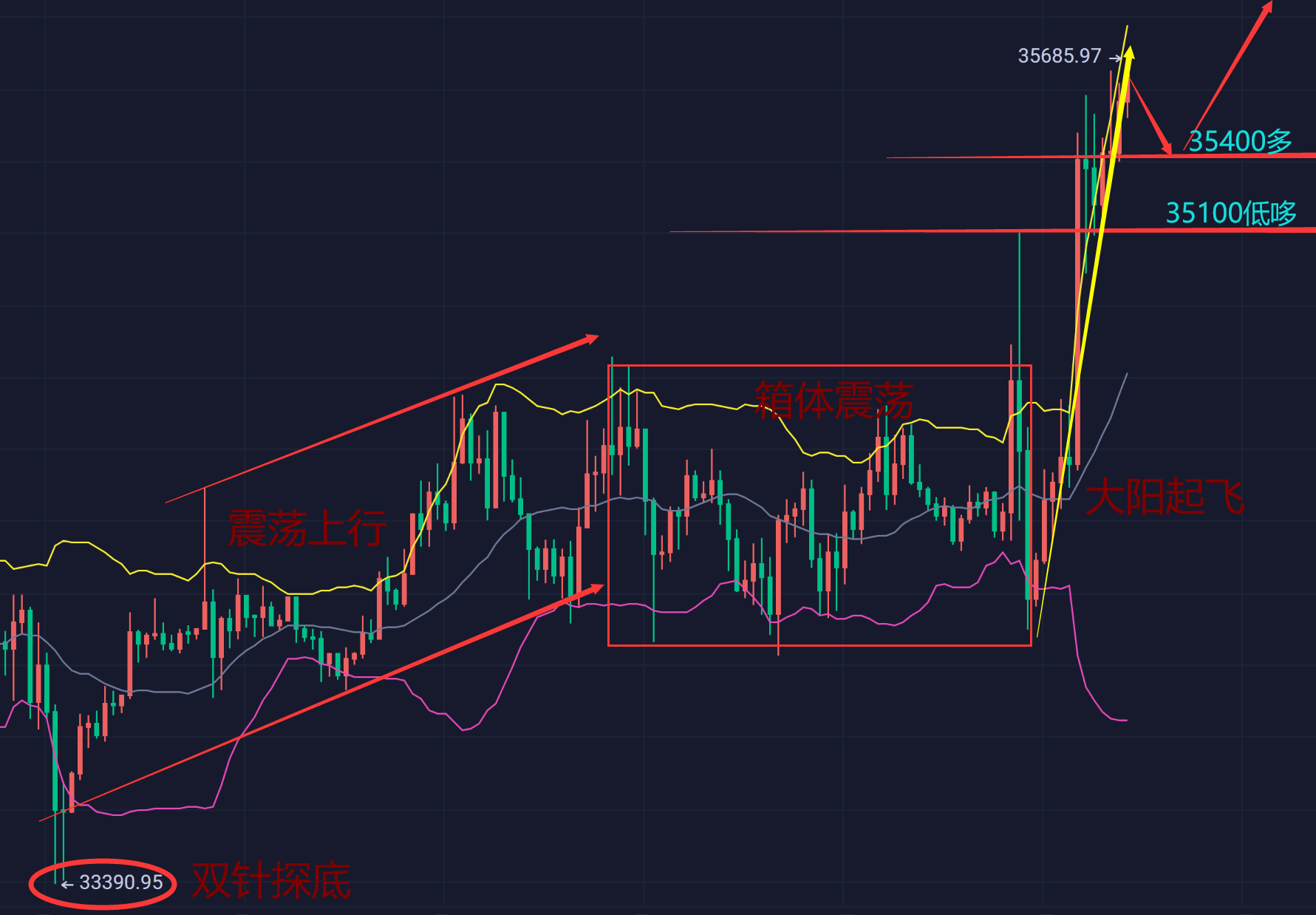 日内思路如图所示,已经很清晰了,行情在33390一线双针探底后震荡上行,随后在34800跟34000这里形成箱体震荡,昨夜是直接大阳线拉飞,今日思路就是回撤接多,回撤35400跟35100这里接多继续看涨,思路就是围绕35000上方低多看涨到36000上方去。