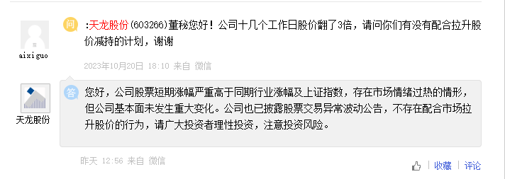 对于近期公司股票短期涨幅严重高于同期行业涨幅及上证指数,存在市场情绪过热的情形。天龙股份表示,公司基本面未发生重大变化。公司也已披露股票交易异常波动公告,不存在配合市场拉升股价的行为。