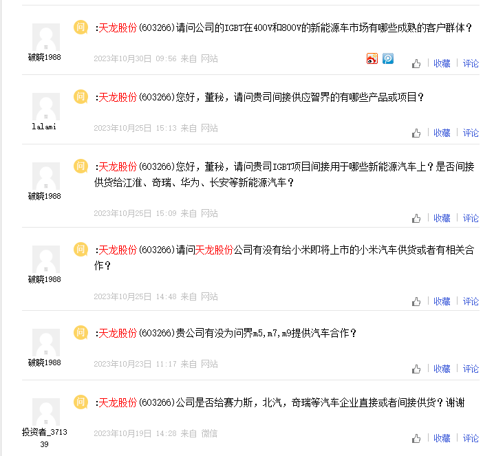 近期,天龙股份频频在互动平台回复相关提问,天龙股份是否与华为存在合作关系、涉及汽车无人驾驶领域的相关产品,以及涉及各类芯片业务的参股公司均为关注重点。