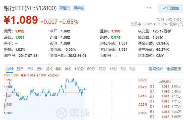 今日(11.2)银行板块平开后红盘震荡,银行ETF(512800)场内价格一度涨近1%,截至发稿涨0.65%,成交额1.37亿元。上市银行股中,民生银行、厦门银行涨近2%,领涨板块;中信银行、邮储银行、农业银行、建设银行等涨幅居前。