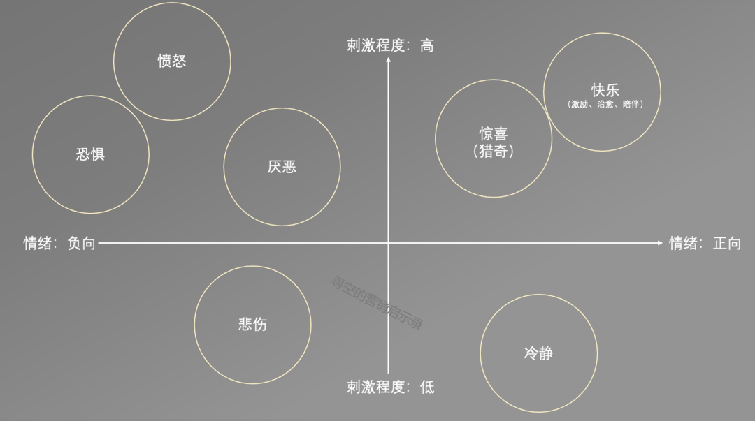 情绪营销应专注于激发高刺激度的情感,如坐标轴中的快乐、惊喜、恐惧和愤怒等,以触及消费者的感性情绪。
