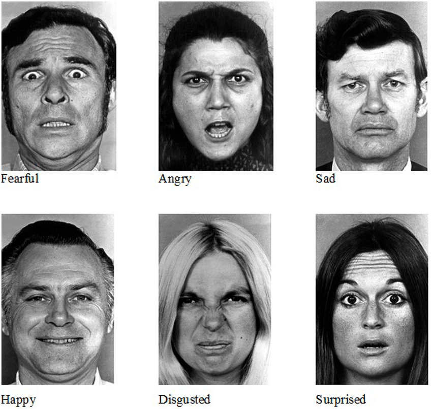 保罗·艾克曼在1972年确定了六种基本情绪:愤怒、厌恶、恐惧、快乐、悲伤和惊喜,且每一种情绪都可以通过面部表情识别,如下图: