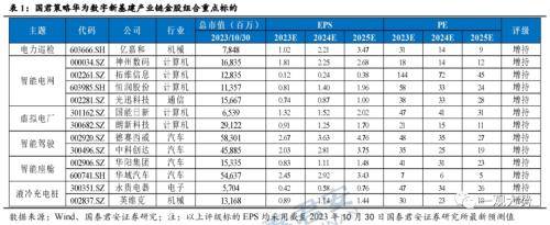 ▶华为不断加码“数字新基建”建设,看好华为在电力数字化、汽车智能化相关产业链投资机会。能源转型,电力是主力军,数字化是核心技术支撑。华为深刻认识到电力行业正处在数字化转型的爆发期,在加快构建新型电力系统的进程下,数字化技术是推动新型电力系统建设的重要引擎。与此同时,随着国内新能源汽车的渗透率快速攀升,未来智能网联汽车增量市场有望达到万亿级规模。华为利用自身在ICT行业的技术优势,致力于成为智能汽车领域的增量部件供应商,并与整个产业链的企业携手拥抱汽车电动智能化变革,一起“造好”车,造“好车”。▶电力数字化有望消纳更多绿色电力,确保电力系统高效稳定、提升效率,推动碳达峰、碳中和的实现。在电力系统全面升级的大背景下,电力数字化的核心在于如何更有效地整合风电、光伏等绿色可再生能源,推动源网荷储的高效互动。华为凭借强大的算力平台+生态优势,通过海量数据的处理和先进的算法技术,在确保电力系统的持续稳定运行的同时,最大程度地优化电力资源的配置,使得电网具备智能决策力和快速执行力,为实现碳达峰、碳中和的目标提供有力支持。在这一背景下,华为的电力数字化不仅局限于技术创新,更注重构建可持续、智能、高效的电力生态系统,为未来能源的转型做出积极贡献。▶汽车智能化有望透过万物互联,促进智能电动和充电网络的协同发展,提升用户体验并加速电动化进程。在汽车智能化转型的时代背景下,智能化的关键在于整合先进的架构平台、智能感知以及通信技术,透过车联网实现车辆智能驾驶、智能电动、以及智能交互的功能。华为清晰定位于动力域和充电网络的解决方案提供商。在动力域方面,华为扮演汽车部件供应商的角色,专注于协助汽车制造商提升车的电动化品质,为用户提供卓越的驾乘体验。在充电网络方面,华为则充当解决方案提供商的角色,不仅致力于研发更快速、更便捷的电动全液冷充电技术,还为充电运营商创造更有吸引力的投资回报。▶投资建议:看好数字基建加码环境下华为在电力数字化、汽车智能化相关产业链投资机会。电力数字化:1)电力数字巡检,推荐:亿嘉和;2)智能电网,推荐:神州数码,拓维信息、恒润股份、光迅科技;3)虚拟电厂,推荐:国能日新、朗新科技。汽车智能化:1)智能驾驶,推荐:德赛西威、中科创达;2)智能座舱,推荐:华阳集团、华域汽车。3)全液冷充电桩,推荐:永贵电器、英维克。▶风险提示:政策推进不及预期;绿色可持续能源消纳不及预期;华为智能汽车解决方案进展不及预期。